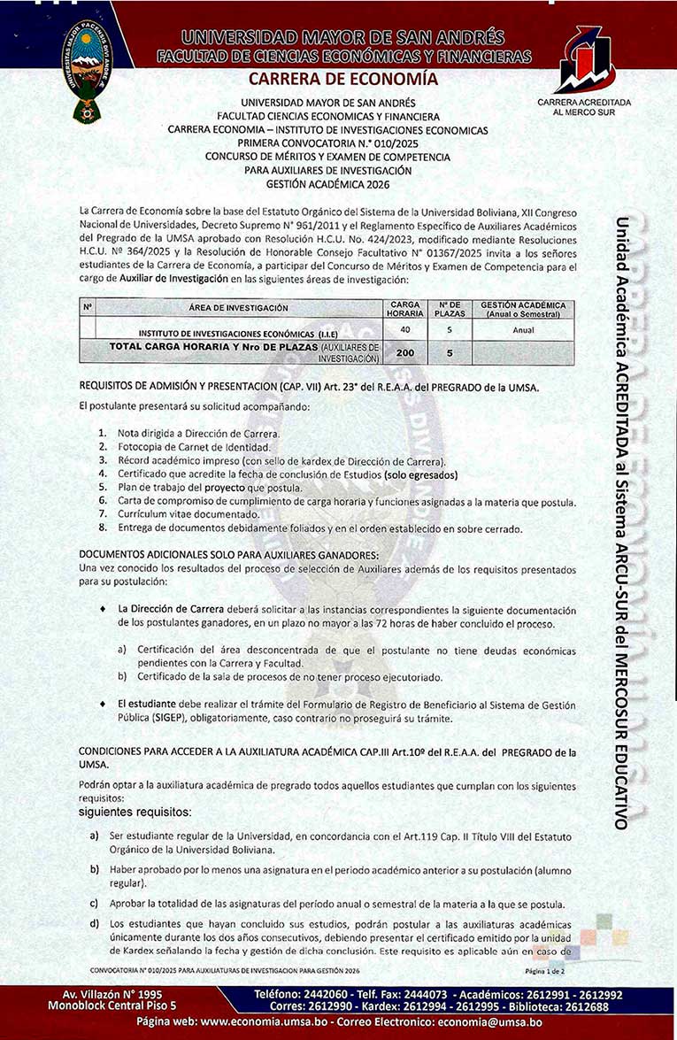 Invitación a los señores estudiantes de la Carrera de Economía, a participar del Concurso de Méritos y Examen de Competencia para el cargo de Auxiliar de Investigación