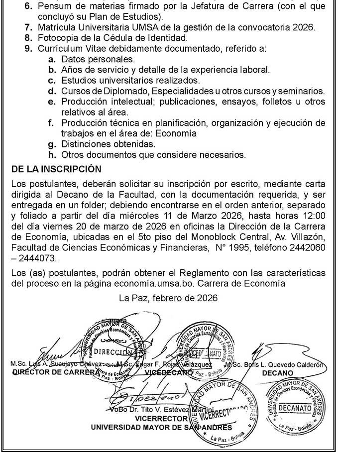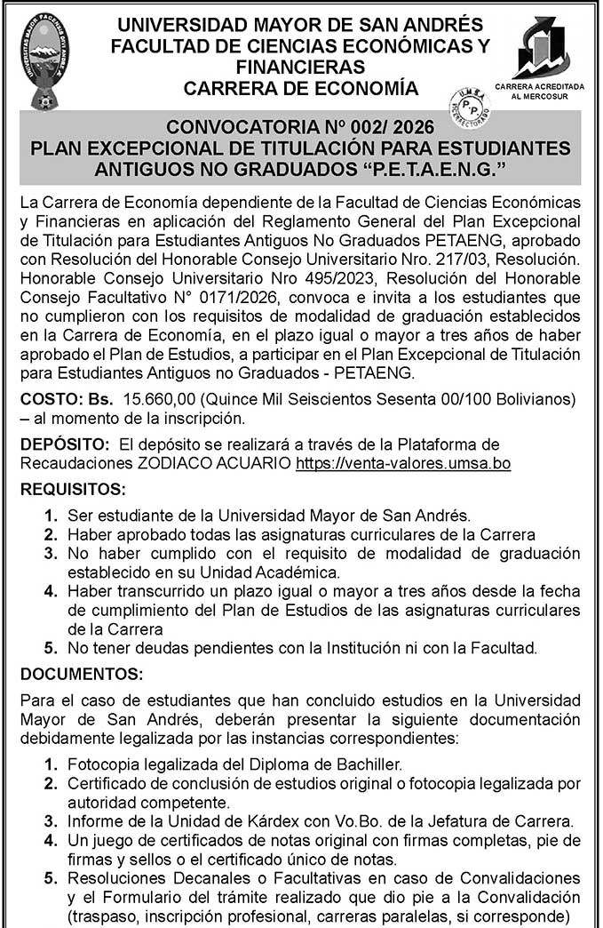 La Carrera de Economía dependiente de la Facultad de Ciencias Económicas y Financieras convoca e invita a los estudiantes que no cumplieron con los requisitos de modalidad de graduación establecidos en la Carrera de Economía, en el plazo igual o mayor a tres años de haber aprobado el Plan de Estudios, a participar en el Plan Excepcional de Titulación para Estudiantes Antiguos no Graduados – PETAENG Gestión 2026