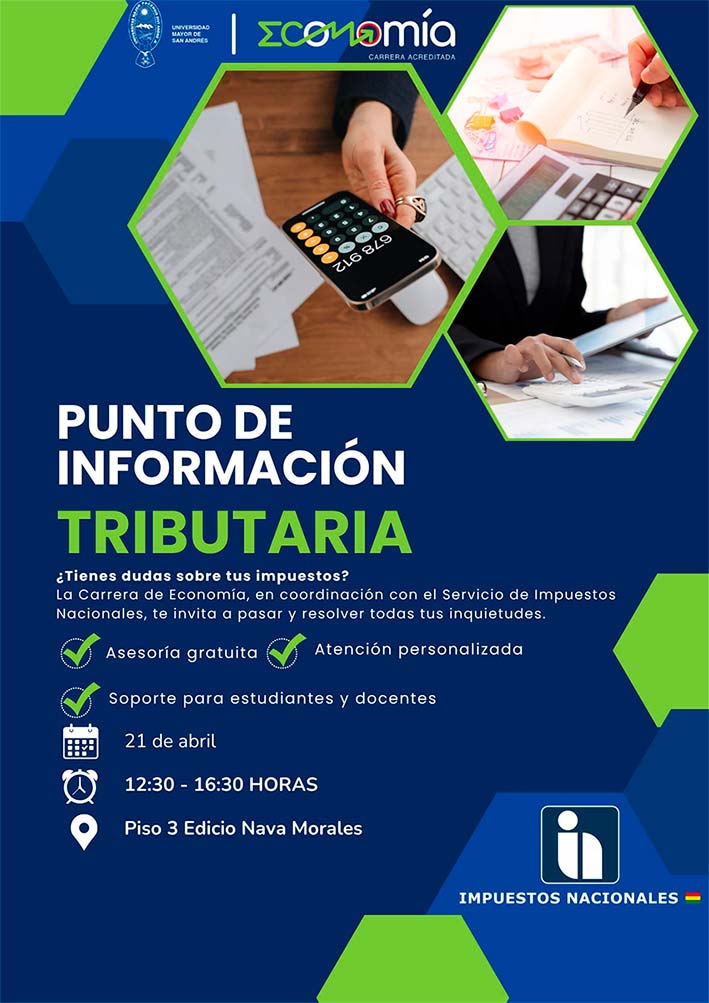 La Carrera de Economía, en coordinación con el Servicio de Impuestos Nacionales, te invita a acercarte y resolver todas tus inquietudes.