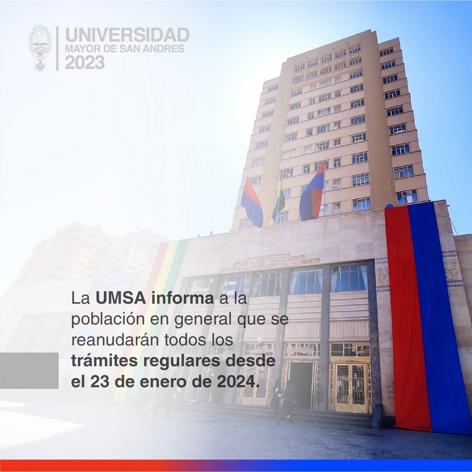 ➡ La UMSA informa a la población en general que se reanudarán todos los trámites regulares desdé el 23 de enero de 2024.